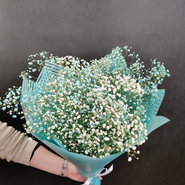 Яркий, стильный и запоминающийся подарочный букет! Маленькие и трогательные цветочки гипсофилы выглядят как колокольчики или маленькие гвоздички. А сама гипсофила символизирует чистоту, искренность и счастье. Подарить такой оригинальный букет, значит сказать человеку, что он - особенный для вас. Состав Гипсофила - 9 шт. Лента - 1 шт. Пленка - 4 шт.