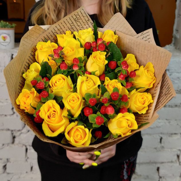 Такой букет способен выразить адресату букета весь спектр испытываемых вами чувств, которые горячим огнем расцветают в вашей душе. Состав Гиперикум (Зверобой) - 10 шт. Роза одноголовая - 19 шт.