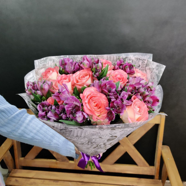 Чудесный букет из альстромерии и роз обязательно порадует вас и ваших близких! Роза - 9 шт. Альстромерия - 10 шт. Лента - 1 шт. Пленка - 2 шт.