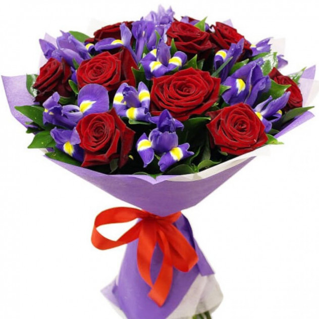Состав: Роза красная 60 см 15шт., Ирис 14шт., Упаковка для букета: фетр, Рускус 10шт.