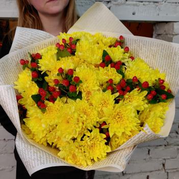 Состав: роза микс 51 шт, оазис, аспидистра, рускус изр., солидаго, декор.