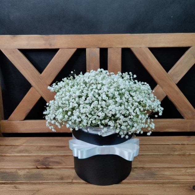 Нежная композиция из белой гипсофилы в изящной шляпной коробке! Превосходный сюрприз на любой случай!
